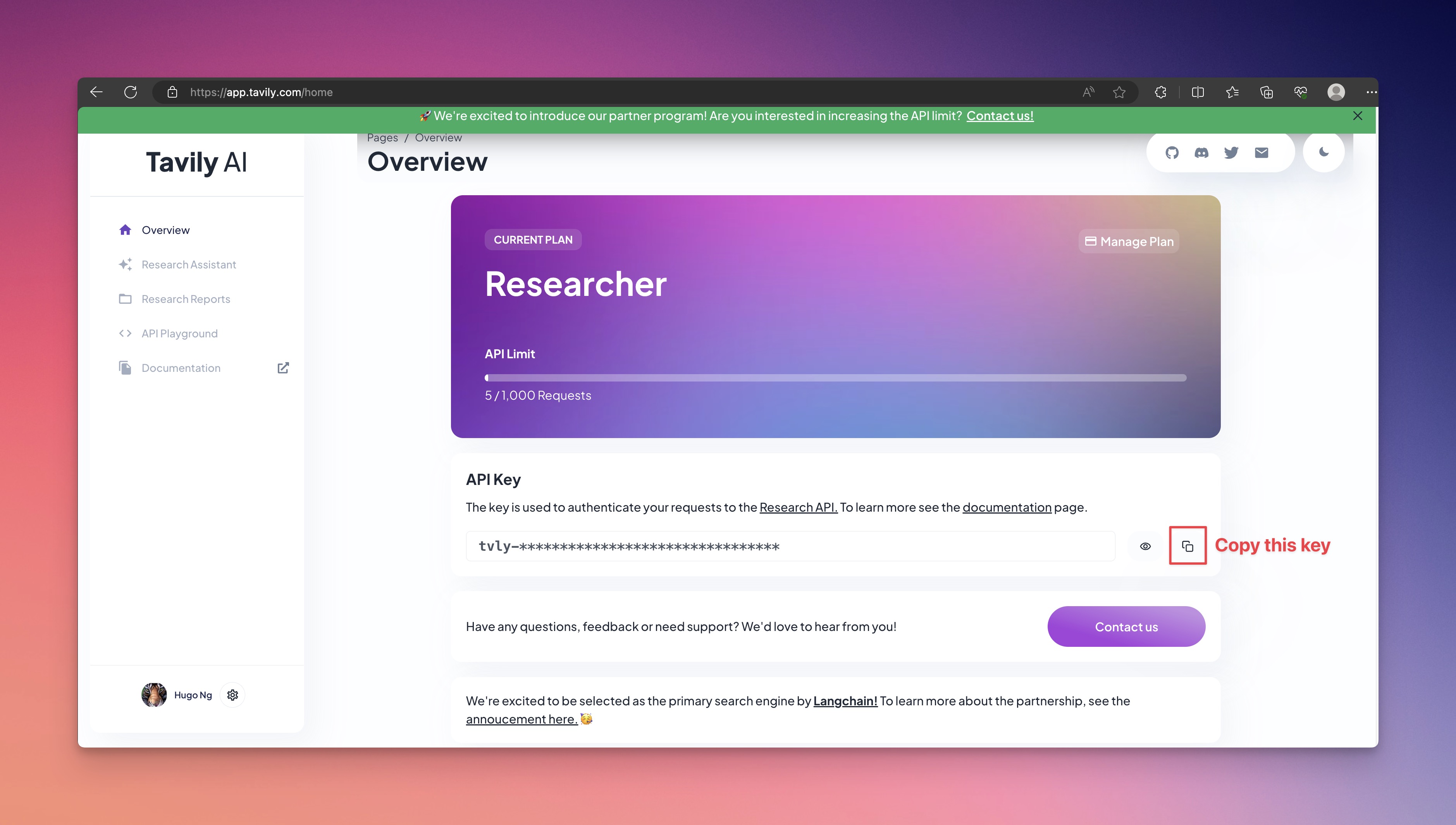 ### Step 4: You will be redirect to <https://app.tavily.com/home>. Go to "API Key" section and copy the key. Keep it secret.